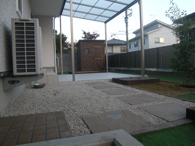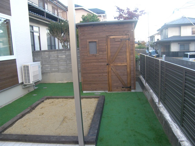 また菜園や小屋、テラス以外のスペースはお客様のご要望により、お子さんたちが自由に走り回れてなおかつ草が生えない 【防草シート+人工芝】にて施工をしています。