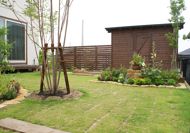 中央の円形花壇には樹木が植えられる予定です。さらにその奥は木製の物置兼駐輪場になります。