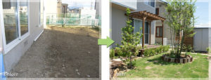 次のお宅では工事前は新築の方なら誰でも見覚えのある土+砂利敷きのまっさらな敷地でしたが、建物の風合いに合ったナチュラルなエクステリアをご提案させていただき、今ではこんなに緑がきれいな空間になりました。