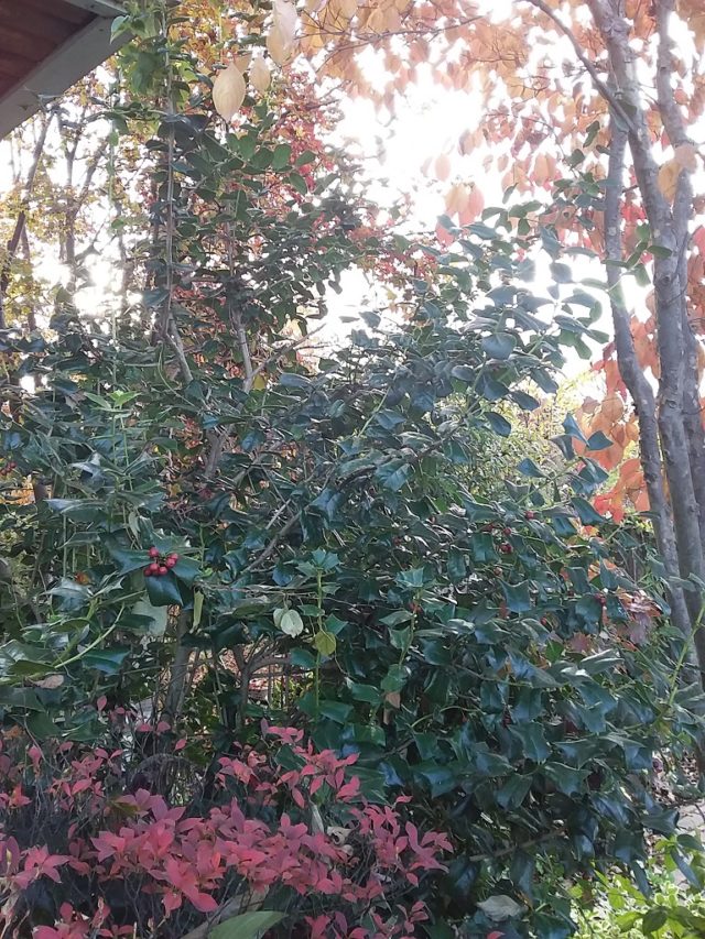(20年でようやくここまで成長したクリスマスホーリーも実が赤くなってきました)