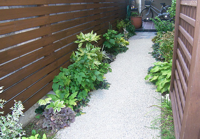 こちらのお宅は建物正面は車2台分の駐車スペースとし、そこから建物脇にある玄関までのアプローチをフェンスと植栽でデザインしました。 幅120cm前後の空間が施工後では、これだけ生き生きとした空間に生まれ変わります。