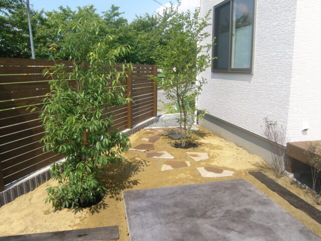 まだ完了清掃時の画像ですが駐車スペースも2台取り、平面的ですが敷き材で変化をつけました。